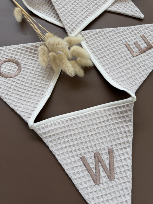Op elk vlaggetje staat 1 letter en wordt aan 1 kant geborduurd. De achterkant van de letters is dus blanco. Aan beide kanten zit er een blanco vlaggetje aan het uiteinde. Wil je graag meer dan 12 letters? Neem dan contact op dan kijken we samen naar de mogelijkheden.