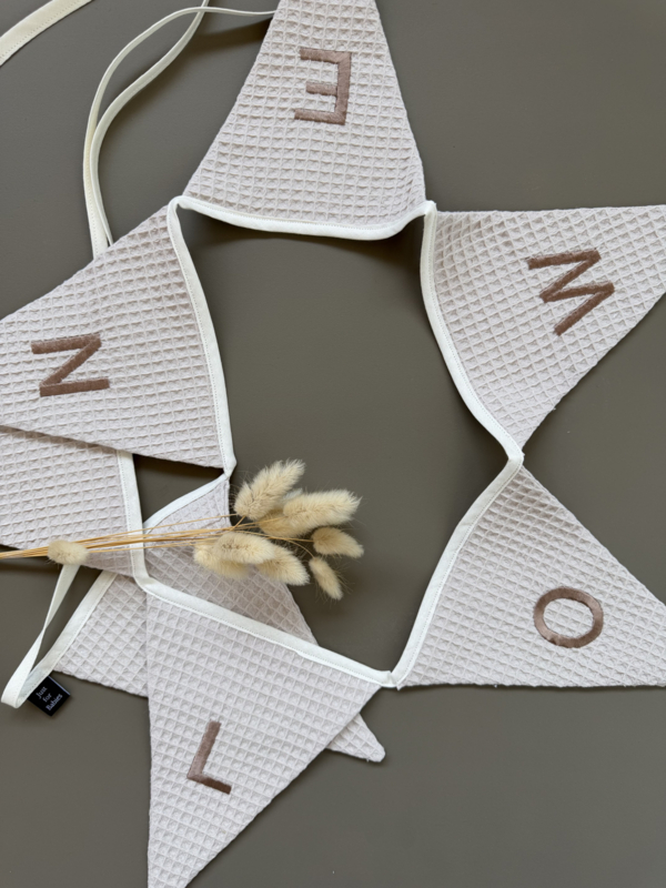 Op zoek naar een unieke en persoonlijke touch voor de baby of kinderkamer? De naamslingers met naam zijn handgemaakt, stijlvol en volledig te personaliseren. Met zachte kleuren en luxe stoffen brengen ze een warme, persoonlijke sfeer in de baby en kinderkamer en zijn ze een mooi aandenken voor later.